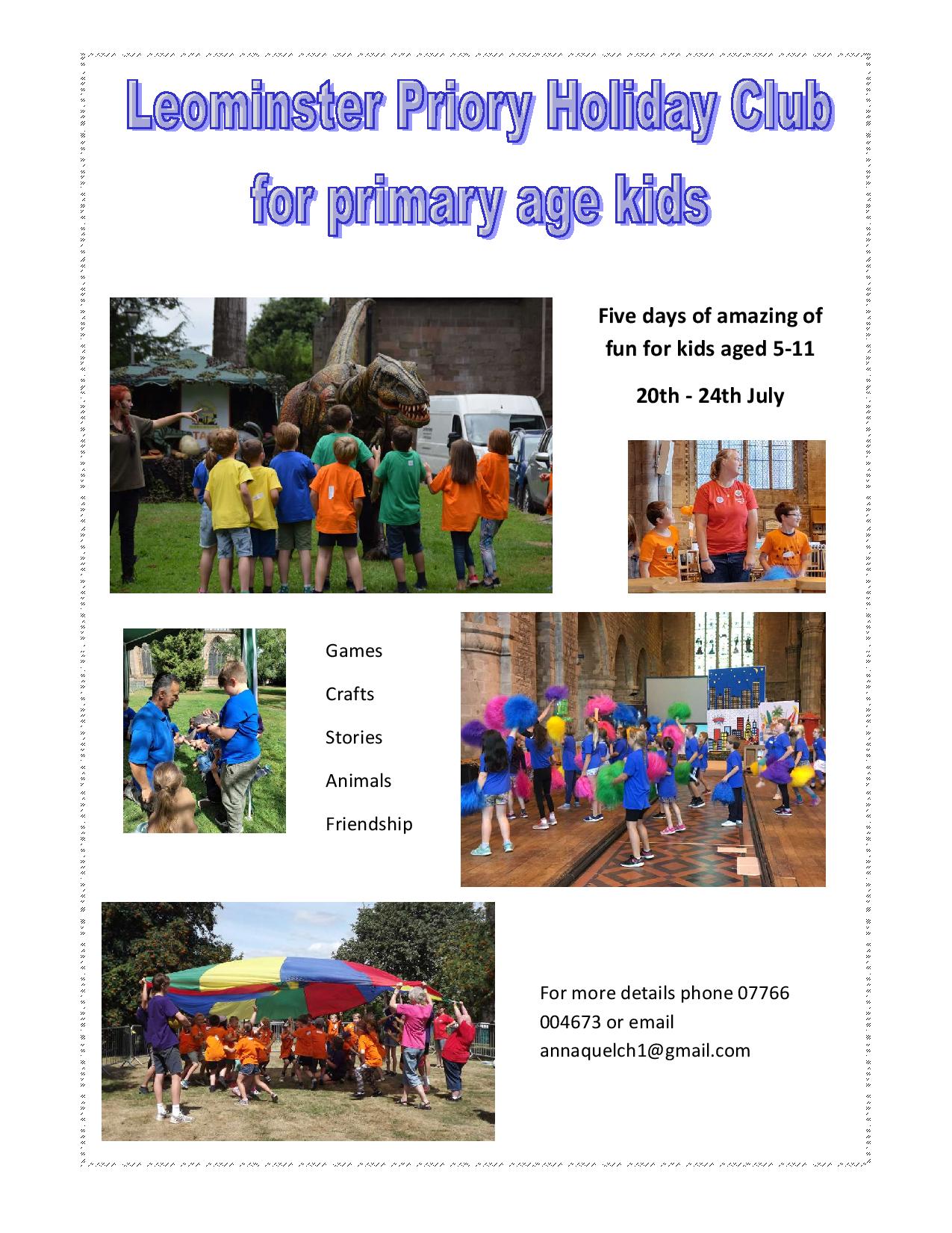 Since 2004 during the first week of the school summer holidays the Leominster Priory Holiday Club has provided an incredible week of fun and activities for 100 primary school age children. The children are split into four age-based groups for the five days, each group having a tailor-made fun packed age appropriate programme of activities, including art, drama, craft, music, dance and outside games, from 9.30 till 3pm. The price includes all activities, drinks, fruit and an event T-shirt for everyone.